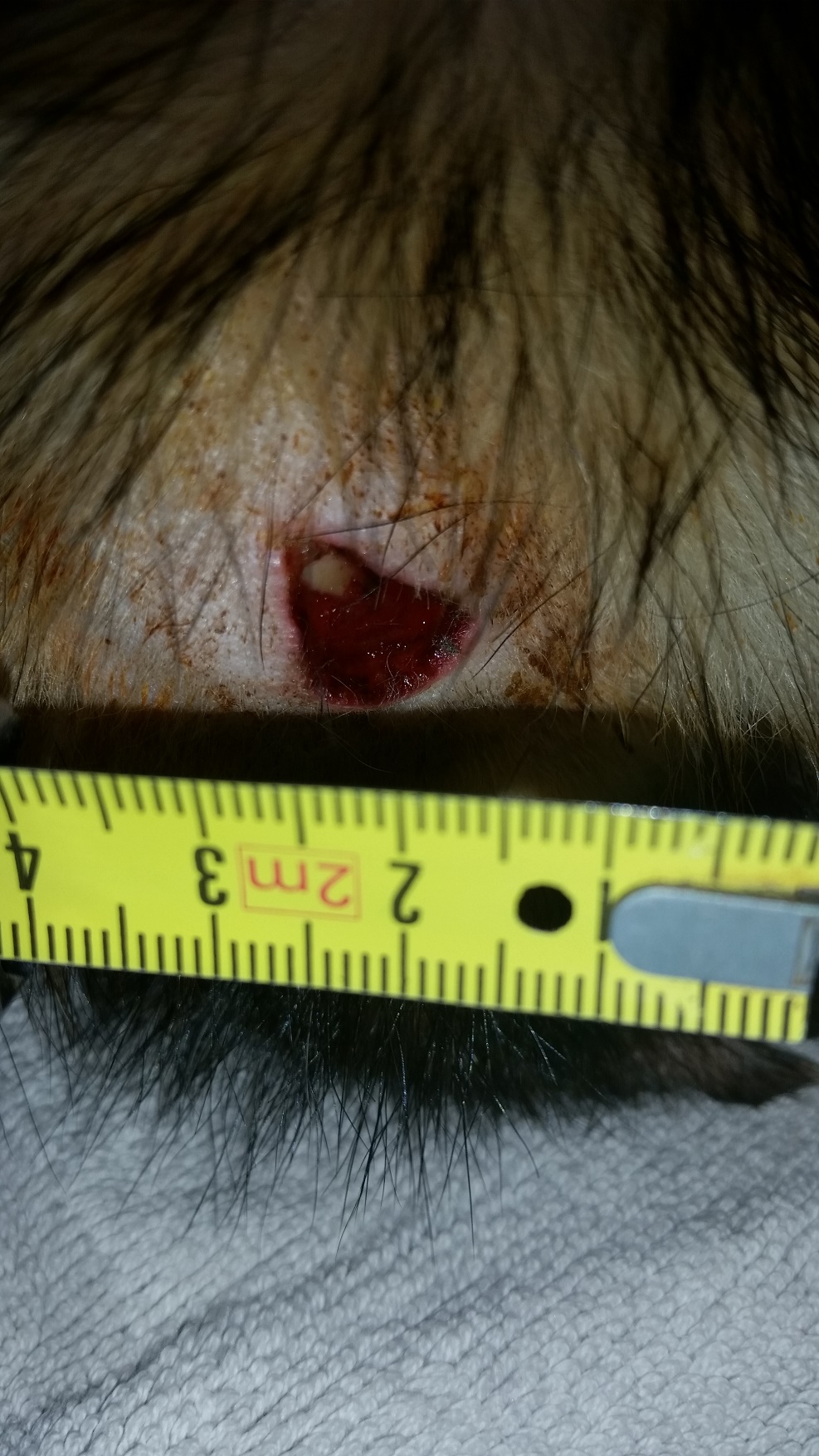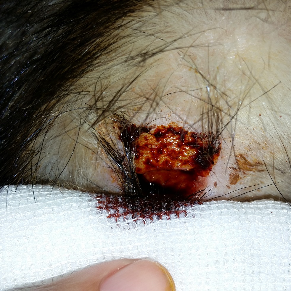 Zur Geschichte: Ich weiss nicht wie er es gemacht hatte. Die Theorie war irgendwo aufgerissen bis hin zum aufgegangenen Abszess, der unbemerkt blieb. Am ersten Behandlungstag wurde eine Wunde in der Größe eines Ein-Euro-Stückes festgestellt und mindestens so tief wie die Münze. Es erfolgte eine medikamentöse Behandlung und die Wunde wurde zweimal geklammert. Nicht genäht wegen der Infektion und da die Wunde extremen ausfluss vom Wundsekrekt hatte. Nach 48 Stunden waren die Klammern offen und in der Tierklinik war nur noch eine Klammer da. Die Chefin der Tierklinik hat 5-6 mal erneut getackert. Tja, hat das ein Ende? Nein! Nach 48 Stunden war keine einzige Klammer mehr da. In der Tierarztpraxis wurde dann eine sekundäre Wundheilung (von innen heraus) festgestellt und ein erneuter Verschluss war nicht mehr möglich. Es begann ein Wundmanagement. D. h. mehrmals am Tag mit unterschiedlichen Mitteln gespült, Wundschaum usw. Die Wunde hat immer durchgängig genäßt und heilte ab ohne Granulation. Die Wunde war dann nach einigen Wochen verschlossen. Ist nun Ende? Nein! Es ist dann wieder aufgebrochen. Fast gleiche Größe und genauso tief. Dann wurde eine chrirurgische Versorgung druchgeführt. D. h. Narkose, ausschneiden, zusammennähen. Und während der Zeit immer wieder Medikamente. Das Ganze hat ca. einen Monat gedauert.