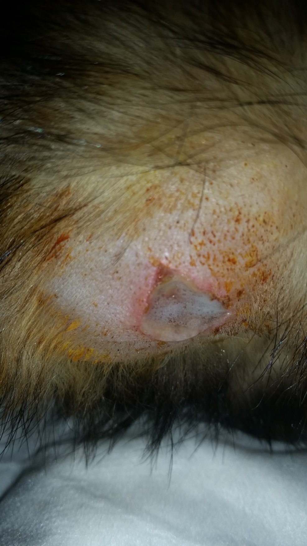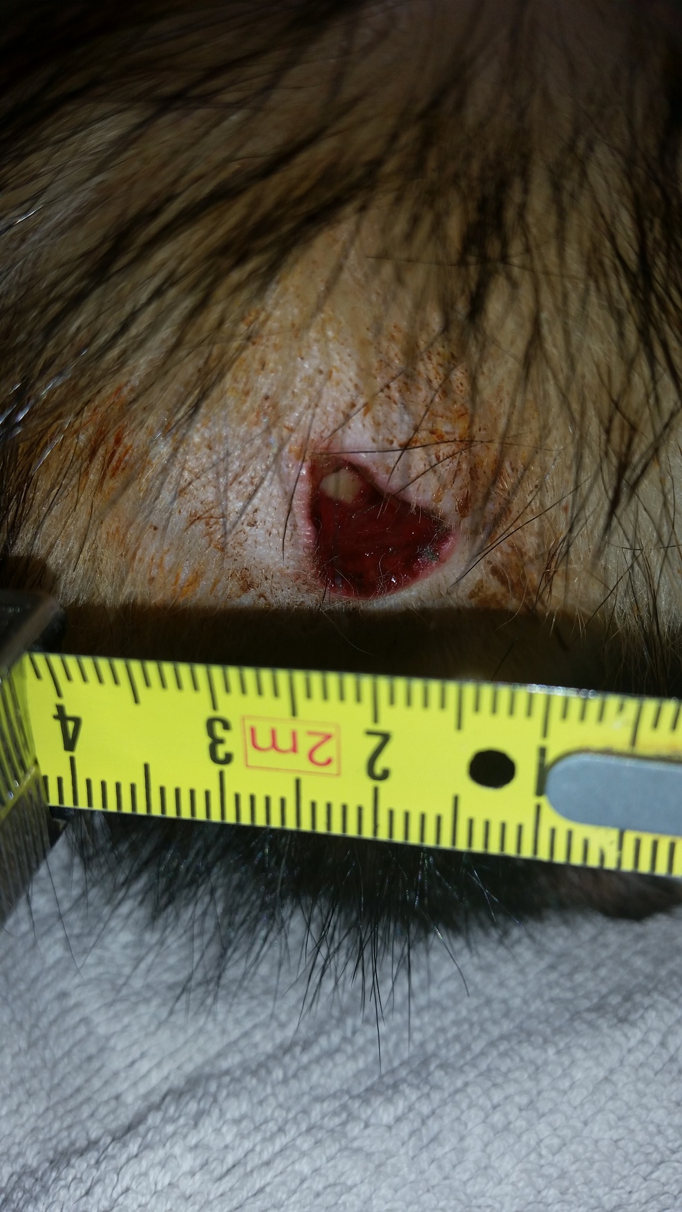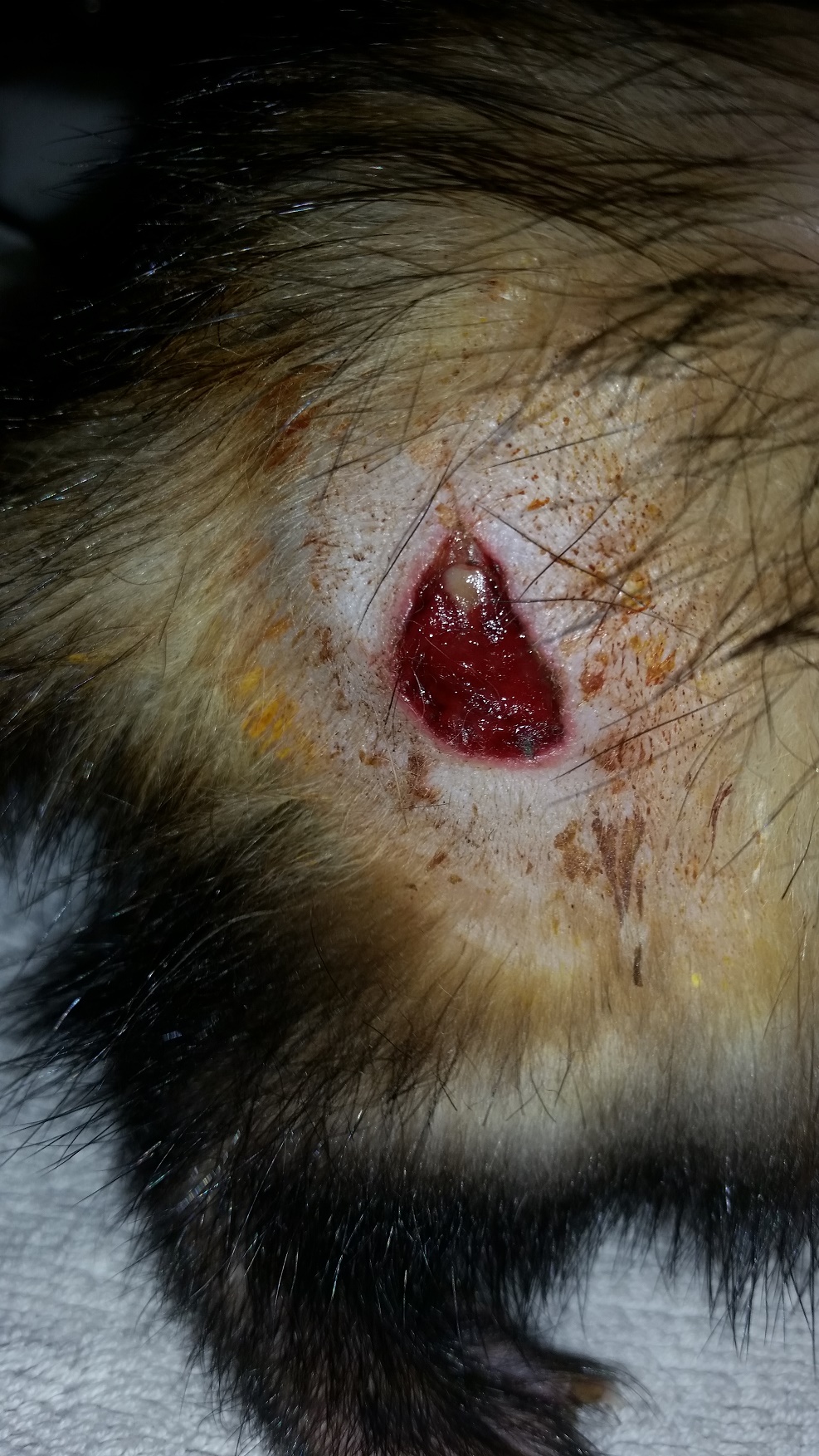 Das schwierige war immer, dass die Wunde genäßt hatte und das Frettchen sich auch auf die Wunde fallen lassen hatte. Immer die Haare aus der Wunde spülen! Haare wieder nachschneiden....Und ja, es sind Bilder mit Haaren dabei, aber macht mal eine Dokumentation und das Frettchen lässt sich immer darauffallen....Stöhn....Ich könnte einen ganzen Roman darüber verfassen...